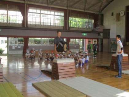 最初は感覚をつかむために、跳び箱の斜め横から入り跳び越す練習をしました。