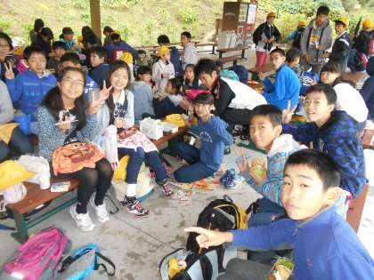 どの写真もみんなの表情がとてもよいです。昼食は雨のため,屋根付きの休憩所になってしまいましたが,班ごとではなく,全員で食べることができ,よい思い出となりました。