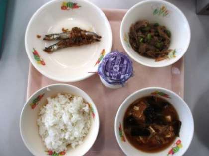 白飯、牛乳、切り干し大根のみそ汁、焼きししゃものねぎだれかけ、れんこん金平
