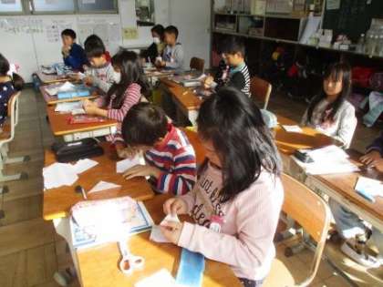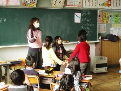 4人の子どもに手をつないでもらい辺の長さを確かめます。