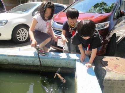 図工室前の観察池から1・2年生の驚く声が聞こえてきました。