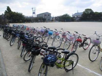 5年生の自転車が整然と並べられています。