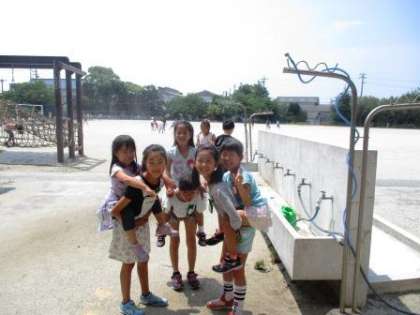 大放課にはおんぶした3ペアがミストで涼を楽しんでいました。