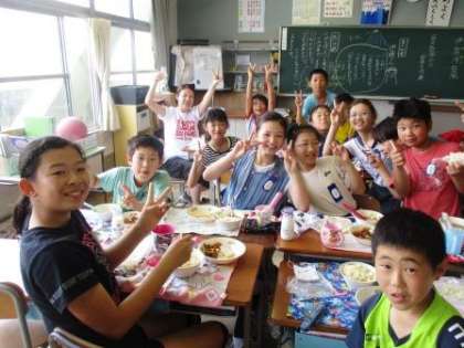 5年3組は横に長い2列にして、12〜3人の大きなグループで食べます。