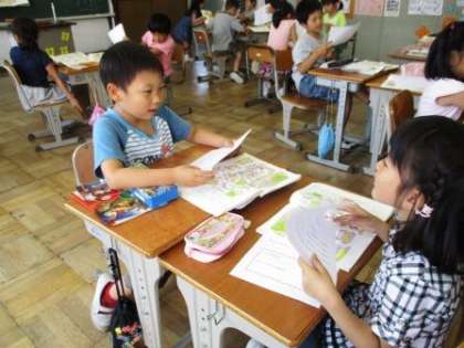 だいじなことをおとさずに 公開日 2017/06/02 更新日 2017/06/02 学校からのお知らせ 2年3組の国語です。 「ともこさんはどこかな」の単元です。 大事なことを落とさずにアナウンスし、迷子を見つけます。 性別、服装、持ち物等の特徴を落とさずに伝えなければなりません。 まずペアで伝え合います。 見つけにくい人は特徴をうまく伝えていません。 ペアで修正します。(これがとっても大事です) そして本番。 みんな上手に伝えることができました。 いいね(0)