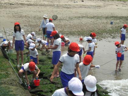 2年生は、鬼崎の海岸に生き物をさがしに行きました。4年生に助けてもらって、かに、魚、やどかりなどを捕まえました。楽しい一日でした。