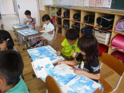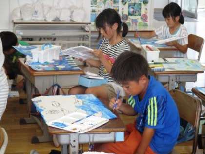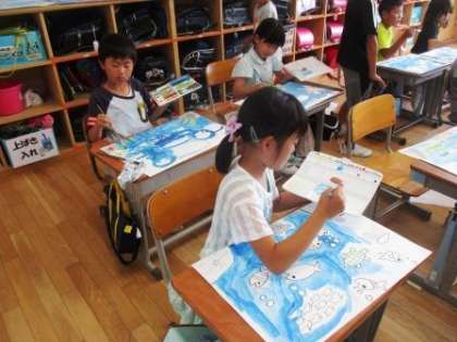 「青い海」という言葉どおり、子どもたちの絵も青が目立ちます。