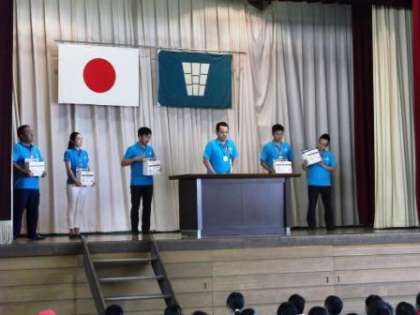 今日は朝会で常滑市商工会議所の皆さんが、子どもたちに趣旨説明と回収のお願いをしました。