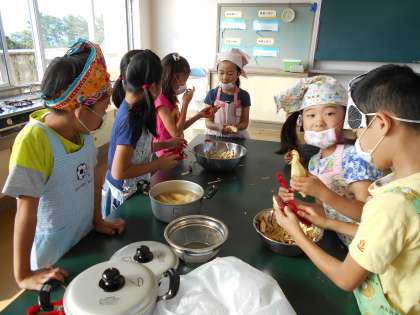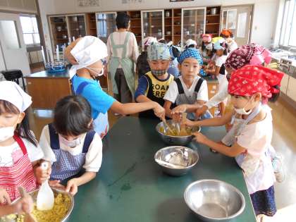 畑で育てたさつまいも。一人1つ持ち帰ったら、ほんの少ししか残りませんでした。そのさつまいもに、少し足して、さつまいもペーストを作りました。洗ったり、皮をむいたり、つぶしたりとみんなで分担して、おいしいペーストができました。ハロウィン集会のお楽しみおやつになります。