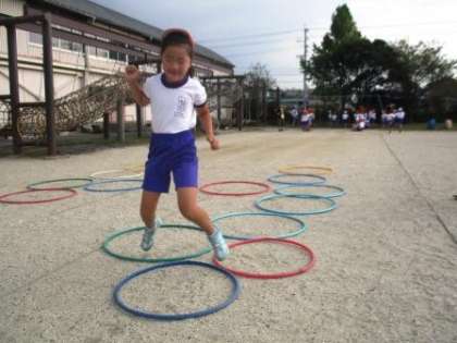 リングに合わせて、片足でケンケンしたり、両足でパをしたりします。