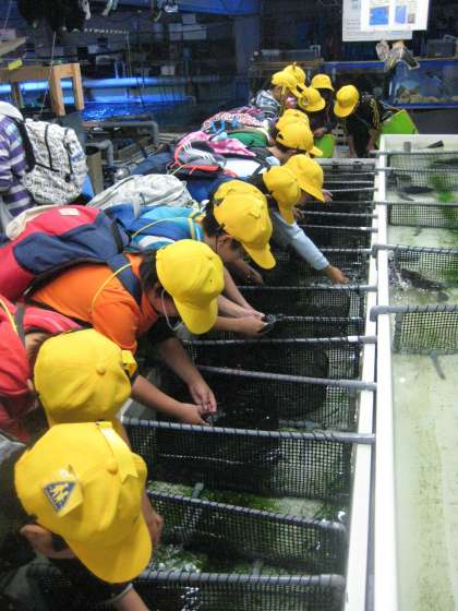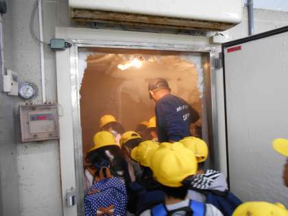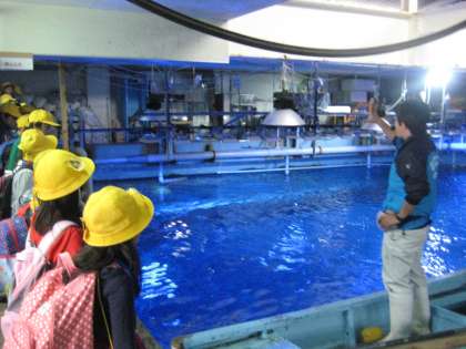 大水槽を上から見たり,ウミガメの赤ちゃんを触らせてもらったり,生き物たちの食べ物である魚が保存されている冷凍庫に入ったり。