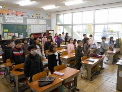 ところで、去年、節分の日にこれ(赤鬼の絵)が教室に来ました。覚えていますか?目に見える「赤鬼」が教室に現れました。この間、その赤鬼さんから校長先生に電話が入りました。「今年も行くからなあ〜!」と言っていましたよ。赤鬼さんが教室に現れたら、赤鬼さんの言うことをしっかりと聞いてください。しっかり聞くと、心の中の「福」が増え、「鬼」が減りますよ。