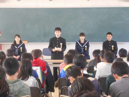 16日(金)5時間目に,中学校の様子について話を聞きました。「生活」「部活」「学習」「行事」について,鬼北小を卒業した4人の先輩(現在 中1)から教えてもらいました。