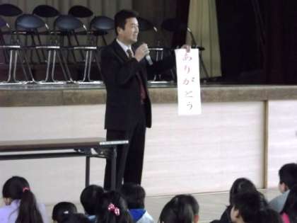 「ありがとう」は大きな行事の時にあらわせばよいのでしょうか?違いますね。1年生の教室に行ったとき、落ちていた鉛筆を拾って渡したら、男の子がありがとうと言ってくれました。落とし物を教室に届け、女の子に渡したら、小さな声で「ありがとう」と言ってくれました。校長先生はとてもうれしかったです。生活の中にある、小さなありがとうも大事にしたいですね。