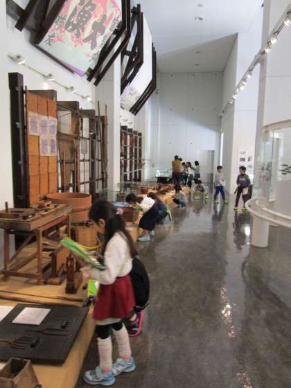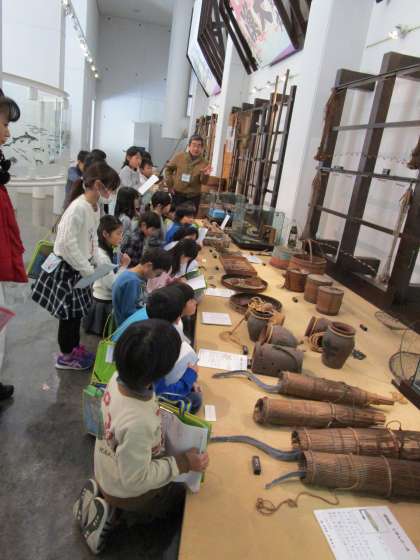 16日に知多市歴史民族博物館へ見学に行きました。たくさんのボランティアさんがいてくださり,コーナーごとに説明をしてくださいました。昔の生活道具,農業で使った道具,漁業で使った道具,大きな船などたくさんの展示物がありました。