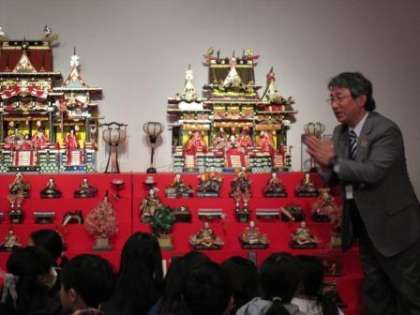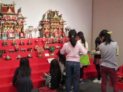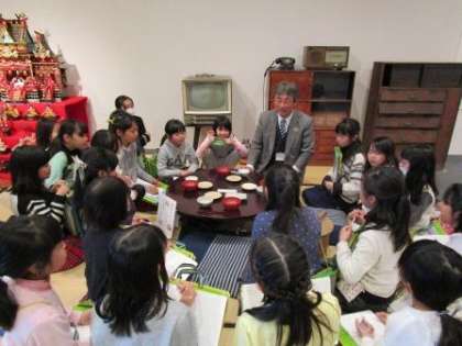 ひな飾りの展示物も見せていただきました。見学前に館の方から「女の子は目が大きくなるよ」と言われていましたが,本当にそのとおりでした。昔の御殿飾りの立派なこと!!その一画にある昔の居間にも上がらせていただきました。お父さんが座る位置などの問題を出され,座布団は主に勧められるまでは座らないことなどを教えていただきました。