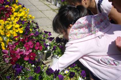 鉢植えの下のダンゴムシを捕まえて集めている子。