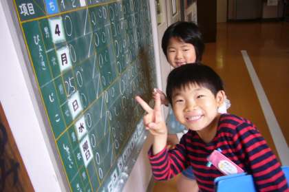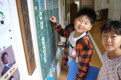朝の健康観察の結果を、職員室前の黒板に記入してくれています。