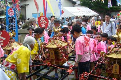 2台の「子供神輿」が各々の地域(蒲池町・小林町)から出発し、「松仙寺」へ揃って打ち込み、お囃子保存会による御神楽奉納とご住職によるご祈祷の後、境内ではもちつき、焼き団子、おでん、水風船釣り、金魚すくい等のバザーが用意され、鯉のぼりが飾られた境内には子どもたちの笑顔がいっぱい見られました。