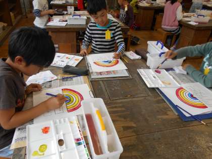 初めて絵の具を使った図工の授業です。図工室で学習するのも初めてです。