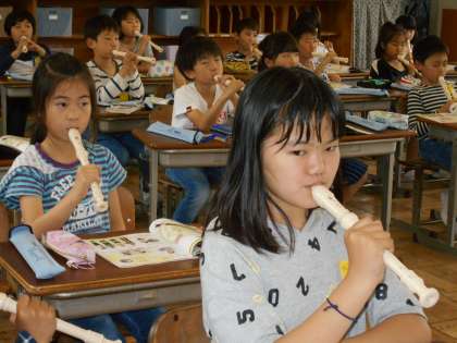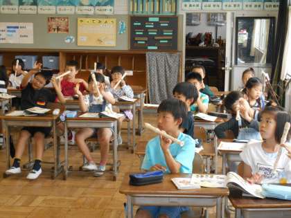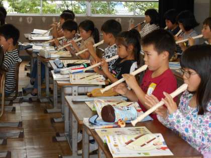 天木先生から、名称や持ち方、タンギングを教えてもらい、「シ」の音の出し方を習いました。これから、教室でもリコーダーの音色が響きます。