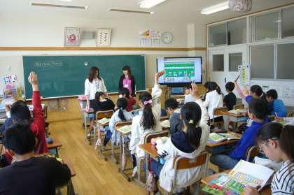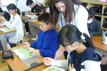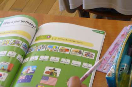 教科書を使い、日本の行事のさし絵と英語で書かれた月を線で結びました。