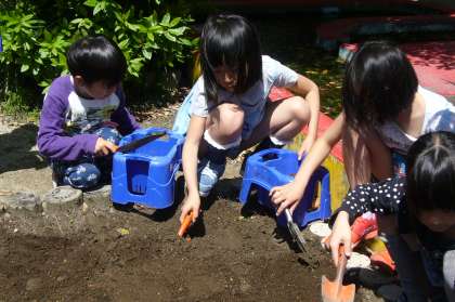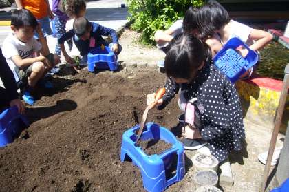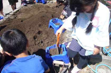 「野菜を育てよう」の学習で、1年生の時に使ったアサガオの鉢で野菜を育てるために、鉢に土を入れました。