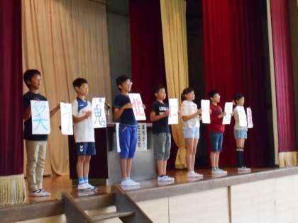 本日の朝会では、総務委員会から、今年の鬼北小のスローガン、「笑う鬼北に福きたる」の発表がありました。
