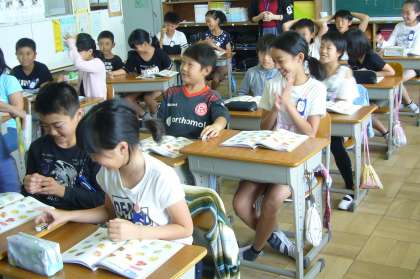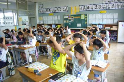 頭の上に両手を乗せ、ALTに続いていろいろな物の単語を発音し、あらかじめ決められた物の単語が出たら机の上の消しゴムを取ります。