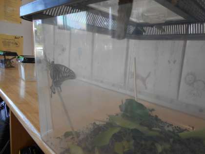 幼虫から育てていたアゲハチョウが、今日1匹飛び立っていきました。音楽の授業から教室に戻ってきたら……立派なチョウに変身していました。昼放課に窓から外に出してあげました。
