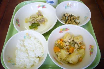 今日は、にんじん、たけのこ、ふき、玉ねぎ、ごぼう、じゃがいも、スナップえんどう、キャベツと、野菜たっぷりでした。