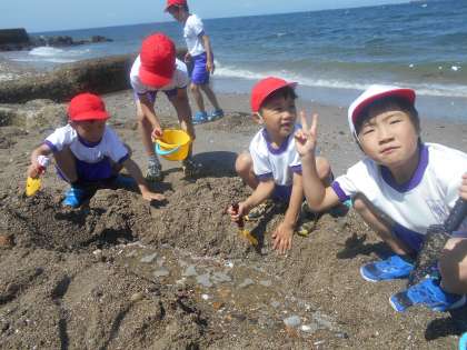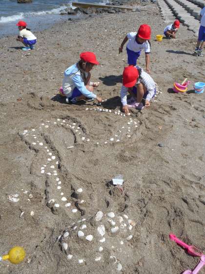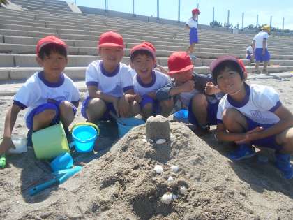 砂を掘ったり,山にしたり,カップで型抜きしたりするなど,一人一人が思いついたことを試しながら,楽しんで活動することができました。お城,ケーキ,プリン,大きな川など,最後はいろいろな作品で砂浜がいっぱいになりました。
