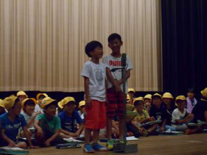 2グループに分かれ、中央公民館の部屋を見学させてもらったり、文化会館のステージに上がらせてもらったりしました。さらに……ステージの上では、マイクを前にして客席に向かってしゃべらせてくれました。