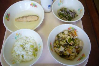 今日はえだまめごはんでした。春ならえんどう豆で豆ごはんが定番ですが、今の時季は、旬の枝豆を使った炊き込みご飯ですね。食感も風味も抜群。シンプルな美味しい炊き込みご飯でした。また、鶏肉を鍋でずりすりして食べたのが始まりとも言われているひきずり(鶏のすき焼き)。キャベツとキュウリにあえたゆかりの塩味を鮭にほどよくからめ、おいしくいただきました。
