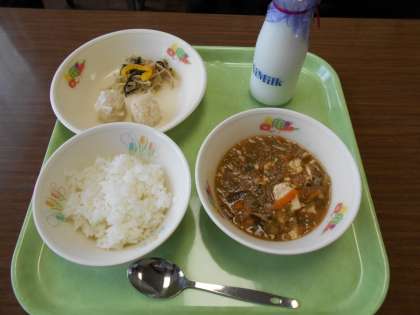 今や学校でも、本格中華が味わえます。もやしと黄ピーマンのいためもの、シャキシャキ感抜群です。大人も子どももおいしい味付けマーボ豆腐、えびの甘さの味わえるしゅうまい。今日もおいしくいただきました。ごちそうさまでした。