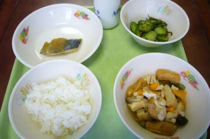 鶏肉やさつま揚げ、にんじん、玉ねぎ、さやインゲン、しめじのそれぞれのうま味がしみた生揚げがほっこりとしたおいしさをかもし出していました。さわらには甘みの効いたおろしだいこん、きゅうりには昆布がほどよくからみ、おいしくいただきました。