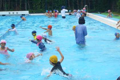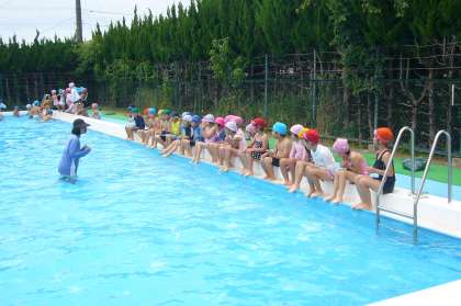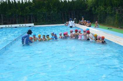少しずつ体に水をかけ、体をプールの水にならしてから入水です。