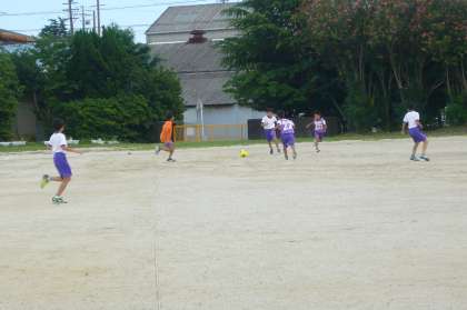 午前中の雨も上がり、風が強く吹く中、運動場ではサッカー部が練習をしていました。