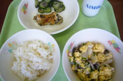 今日は発芽玄米ごはんでした。GABA、ビタミン、ミネラル、食物繊維がたっぷりの発芽玄米ごはん、しっかり噛んで、おいしくいただきました。たまごとじは、たまごのやわらかさがほどよく、やさしい味でした。鶏肉のアカモク入り塩焼きと、きゅうりにあえたゆかりの塩味は、暑さでバテ気味な体や熱中対策に効果あり、だと思います。