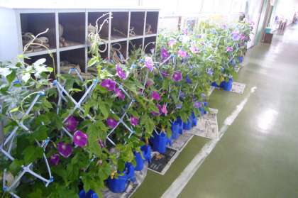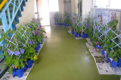 強風を避けるために、1年生はアサガオを昇降口近くのろうかに移動させました。