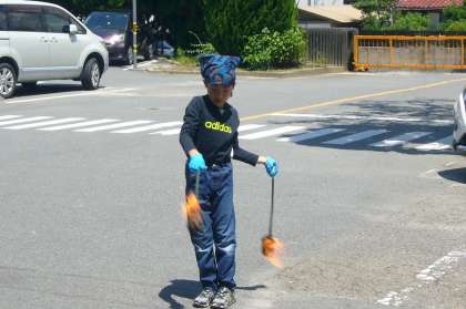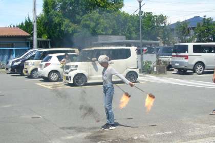 明日のファイヤーダンス事前披露に向け、実際に火をつけたトーチの重さや回した時の感覚などを確かめました。