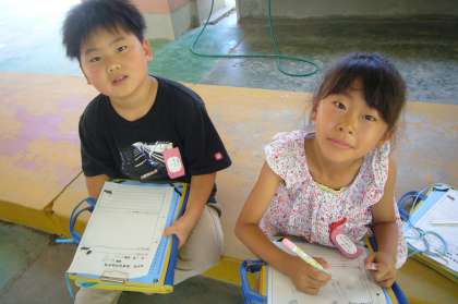 暑い中、メダカやエビ、ツバメ等を観察しました。