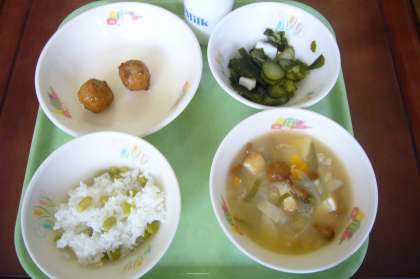 今日はえだまめごはんでした。旬の枝豆を使った炊き込みご飯、食感も風味も抜群のおいしい炊き込みご飯でした。また、ぶた肉、生揚げ、にんじん、玉ねぎ、ねぎ、なめこ、ジャガイモを具としたうまみたっぷりの実だくさん汁や、ごぼうのこりこり感がいいごぼうつくね、そして、バテ気味の体に優しいキュウリとイカの酢のものと、おいしくいただきました。