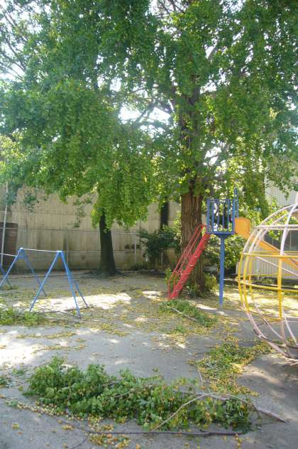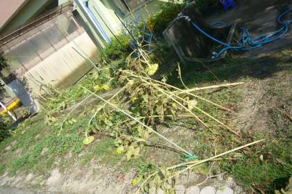 イチョウの木は枝が折れたりギンナンが落ちたり、1年生花だんのヒマワリや森の木は強い風に倒されたりと・・・。