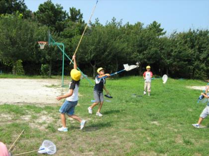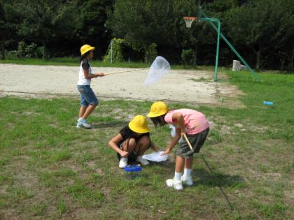 みんな夢中になって校庭を走り回り、バッタやトンボ、カマキリなどつかまえました。