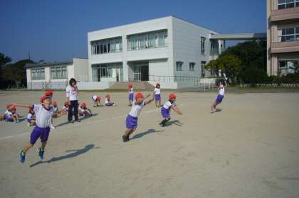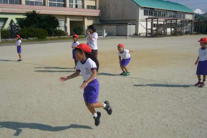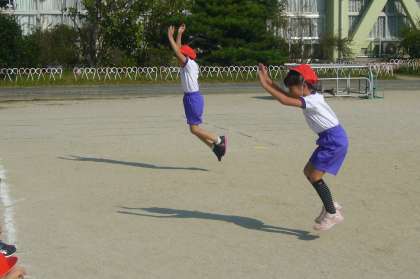 手を下から上にふりあげて、その勢いも使って前にジャンプ!