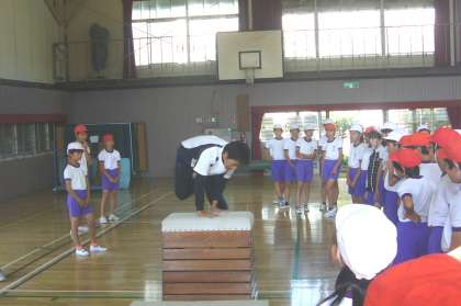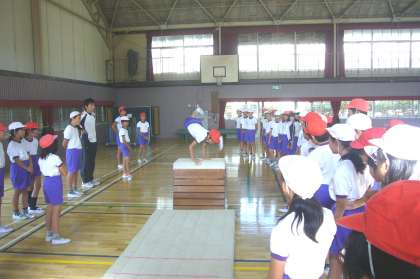 抱え込み跳びやよこ跳び越えの手本を全員で見てコツを確認した後、