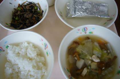 今日はさばのぎんがみやきでした。ご飯が何杯でも食べられそうなくらいのおいしさで、納得の人気給食メニューです。ひじききんぴらはごぼうの食感がよく、ご飯に混ぜ合わせてきんぴらご飯としておいしくいただきました。また、とり肉、にんじん、ねぎ、だいこん、はくさい、なめこ、さといも、を具とした実だくさん汁はうまみたっぷりでした。