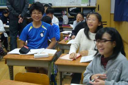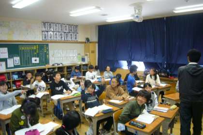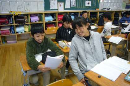 教科書に記載されている絵とその説明を確認した後、電子黒板に映し出された教科書には記載されていない鳥獣戯画を見て、その説明文を考えました。