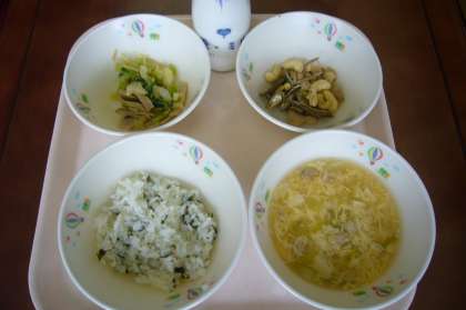 今日はわかめごはんでした。わかめの食感と風味も抜群のシンプルな美味しい炊き込みご飯でした。かき玉汁はだしが丁寧にとられ、卵がふわふわでおいしかったです。カシューナッツのあまからいためは、鶏肉とカシューナッツ、そしていっしょに入っていた煮干しをしっかりかんでいただきました。ハム、こまつな、もやし、きゃべつ、が混ぜ合わされた千草和えもおいしくいただきました。